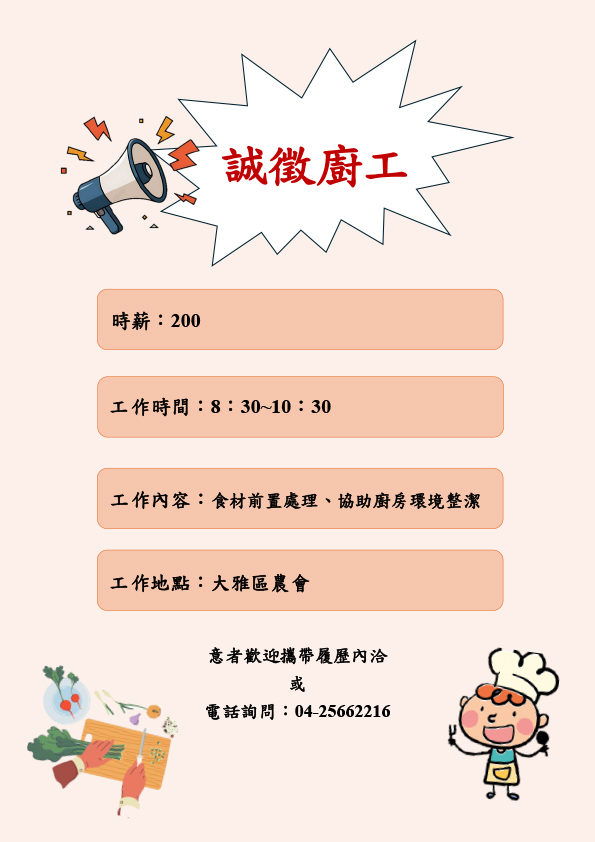 招募鐘點廚工